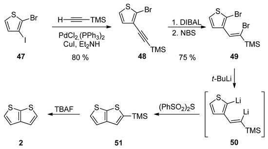 Method 12 towards 2, is a similar reaction pathway to Method 6 (see Scheme 6 and Scheme 12) used for the construction of 1 [36]. Both methods differ in the halide substitution of the starting thiophene 47 vs. 26. Starting from 2-bromo-3-iodothiophene 47 and involving the Sonogashira reaction, reduction, bromination, lithiation, cyclization and the TMS-group removal, TT derivative 2 can be prepared in an 18% overall yield (Scheme 12).
