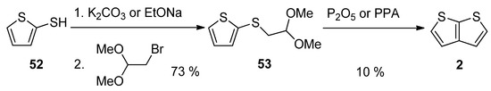 This method, utilizing acetal 53, is analogous to Method 3 working with acetal 13 (see Scheme 3 and Scheme 13) [32,51]. The starting 2-sulphanylthiophene 52 replaced the bromine atom in 1,1-dimethoxyethylbromide as S-nucleophile in the presence of potassium carbonate [51] or sodium ethanolate [32]. The formed acetal 53 was cyclized to 2, using phosphorous oxide [32] or polyphosphoric acid (PPA) [51]. The overall yield of this reaction sequence is 7%.
