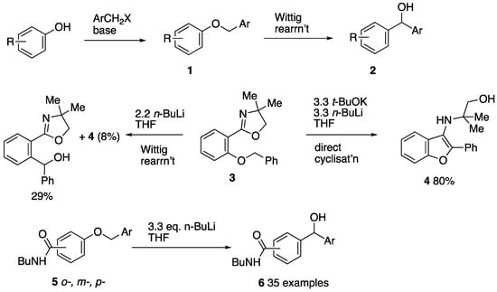 - Aitken, R.A.; Harper, A.D.; Inwood, R.A. Further studies on the [1,2]-Wittig rearrangement of 2-(2-benzyloxy)aryloxazolines. Molecules 2022, 27, 3186. [Google Scholar] [CrossRef] [PubMed]