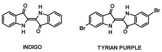 The art of textile dyeing is an activity as old as mankind, as colored textiles have been found in archeological excavations in the oldest civilizations. However, it should be emphasized that heterocyclic dyes have also been in use since prehistoric times. At that time, only natural dyes obtained from natural resources of plant, animal, mineral, and microbial origin were used []; many of them were, in fact, natural heterocyclic dyes such as indigo (obtained from the leaves of Indigofera tinctorial) and Tyrian purple (obtained from the shells of mollusks of the Muricidae family), which were used to dye textiles in blue and purple, respectively (Figure 1).