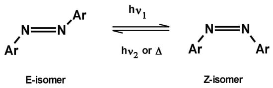 The case of isomerization of azobenzene has been extensively studied and analyzed. In this case, the photochromic system is of the T-type, and the azobenzene in the E-configuration is more stable than in the Z-form. The two isomers differ not only in their structure and properties, but they also exhibit different absorption spectra in the UV spectrum (Figure 6). The different spectral position of the bands indicates that not only is the wavelength of light required to induce the reaction different for the two isomers, but they also have different colors [].