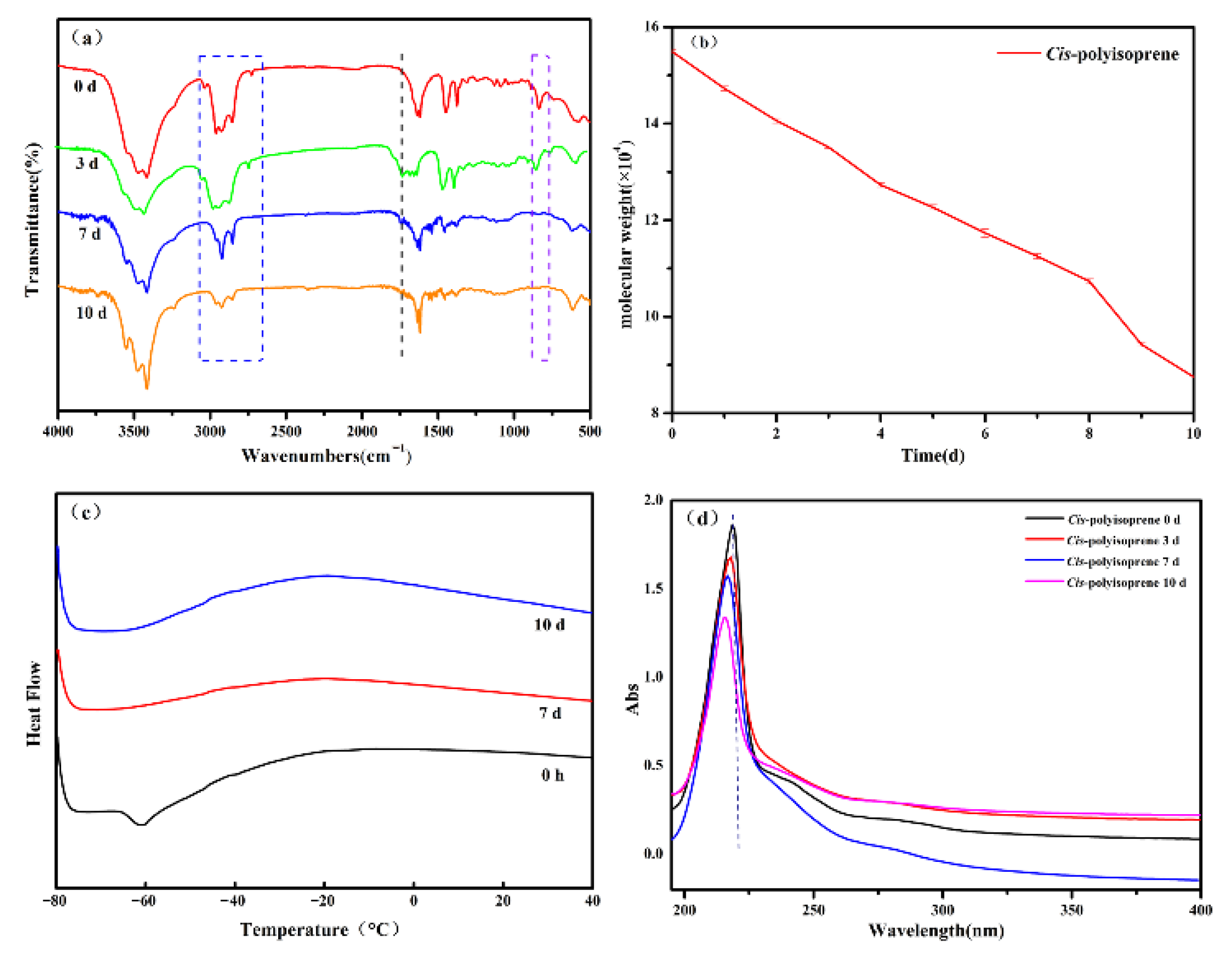 Figure 1. (a) FTIR spectra of cis-polyisoprene with different UV aging times, (b) Mw of cis-polyisoprene, (c) DSC spectra of cis-polyisoprene with different UV aging times; and (d) UV–Vis spectra of cis-polyisoprene with different UV degradation times.