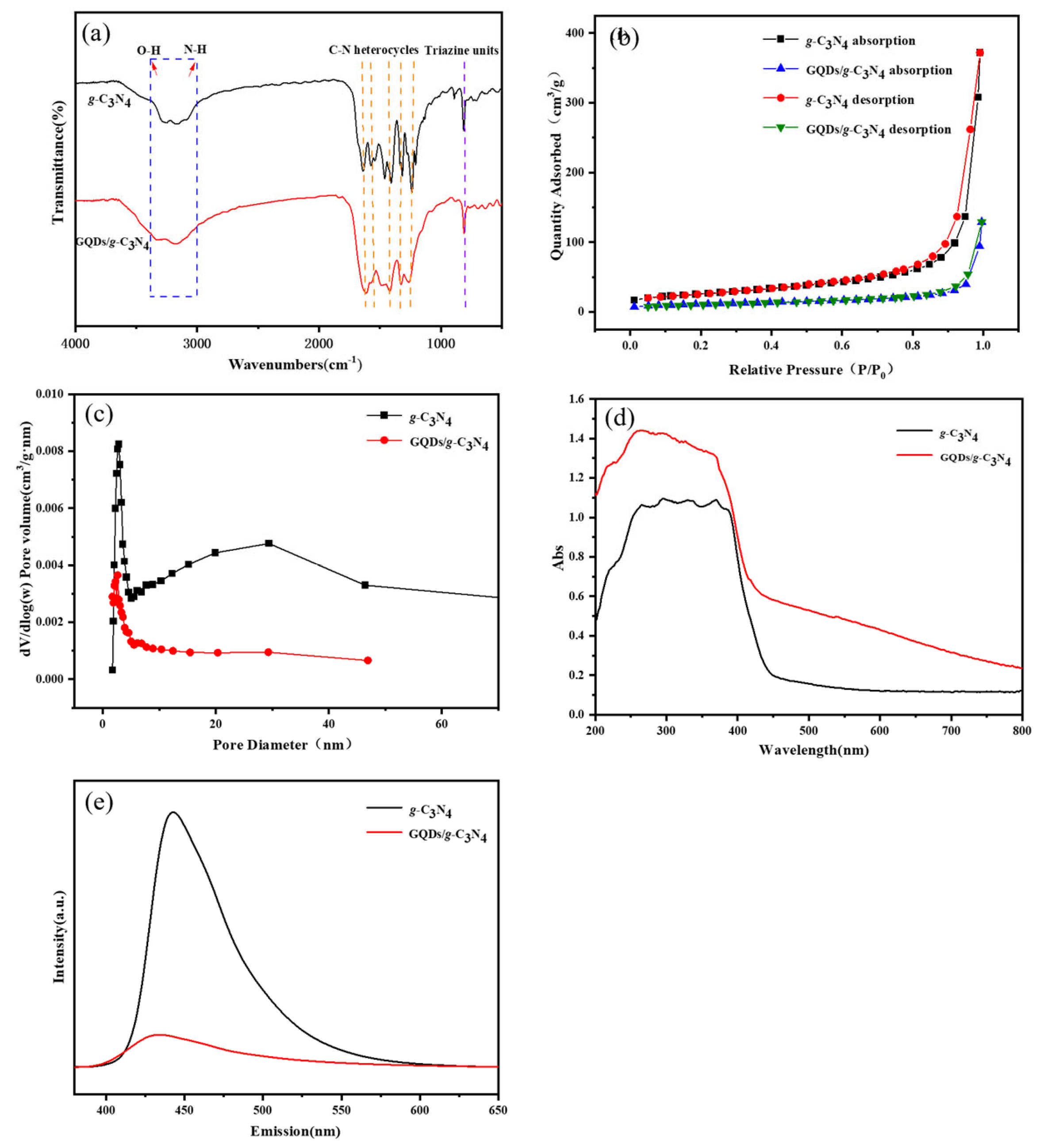 Figure 3. (a) FT-IR spectra of g-C3N4 and GQDs/g-C3N4 composite, (b) Nitrogen adsorption–desorption curve, (c) Pore size distribution of g-C3N4 and GQDs/g-C3N4, (d) UV-vis DRS spectra of g-C3N4 and GQDs/g-C3N4 composite; and (e) PL spectra of g-C3N4 and GQDs/g-C3N4 composites.
