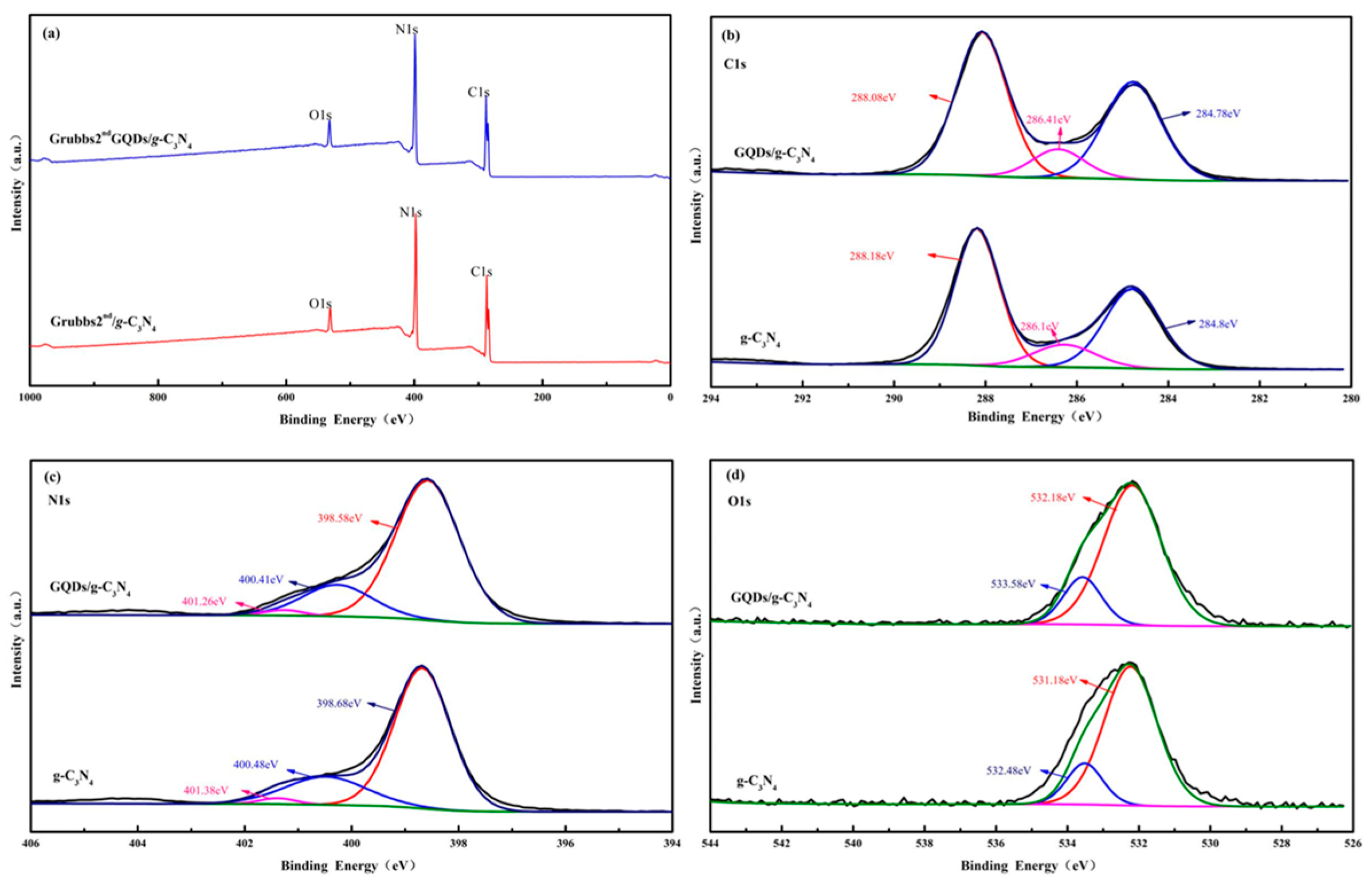 Figure 4. XPS spectra of the g-C3N4 and GQDs/g-C3N4 samples. (a) XPS patterns of g-C3N4 and GQDs/g-C3N4, (b) C1s XPS survey spectra of g-C3N4 and GQDs/g-C3N4, (c) N1s XPS survey spectra of g-C3N4 and GQDs/g-C3N4, (d) O1s XPS survey spectra of g-C3N4 and GQDs/g-C3N4.