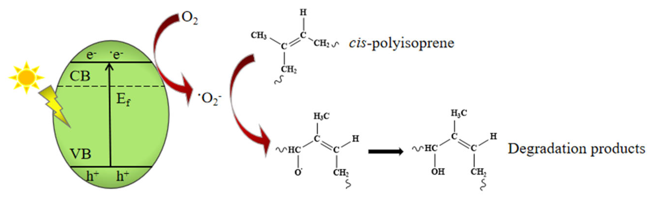 In order to promote the degradation of cis-polyisoprene, the GQDs/g-C3N4 nanoparticles as a photocatalyst were applied to the procedure of UV irradiation. The similar energy band structure of GQDs and g-C3N4 can form an internal electric field, which ensures the stability of interfacial carrier transport. The performance of photocatalytic degradation was significantly improved, and the catalytic process is shown in Figure 5. The electrons of g-C3N4 transfer from VB to CB and then separate immediately to migrate to the surface [41]. GQDs/g-C3N4 can promote the generation of photoelectron-hole pairs under the condition of UV irradiation. Because EƟCB (−1.19 eV) has a more negative charge than EƟ (O2/·O2−) (−0.046 eV) [39,42], the photoelectrons can carry out a reduction reaction with the dissolved O2 to produce the active species of ·O2−. The photoelectrons of GQDs transfer to the surface of g-C3N4 and react with O2 to produce the ·O2−. The generated ·O2− will attack the polymer chains of polyisoprene and promote the formation of degradation products. GQDs/g-C3N4 nanomaterials contain rich functional groups, and the possibility of reactions between cis-polyisoprene and functional groups cannot be ruled out. However, it is limited by the complexity of functional group reactions and the rather low activity of functional groups in aqueous conditions. The reactions of functional groups were ignored, and the highly reactive free radical reactions were discussed in this work.