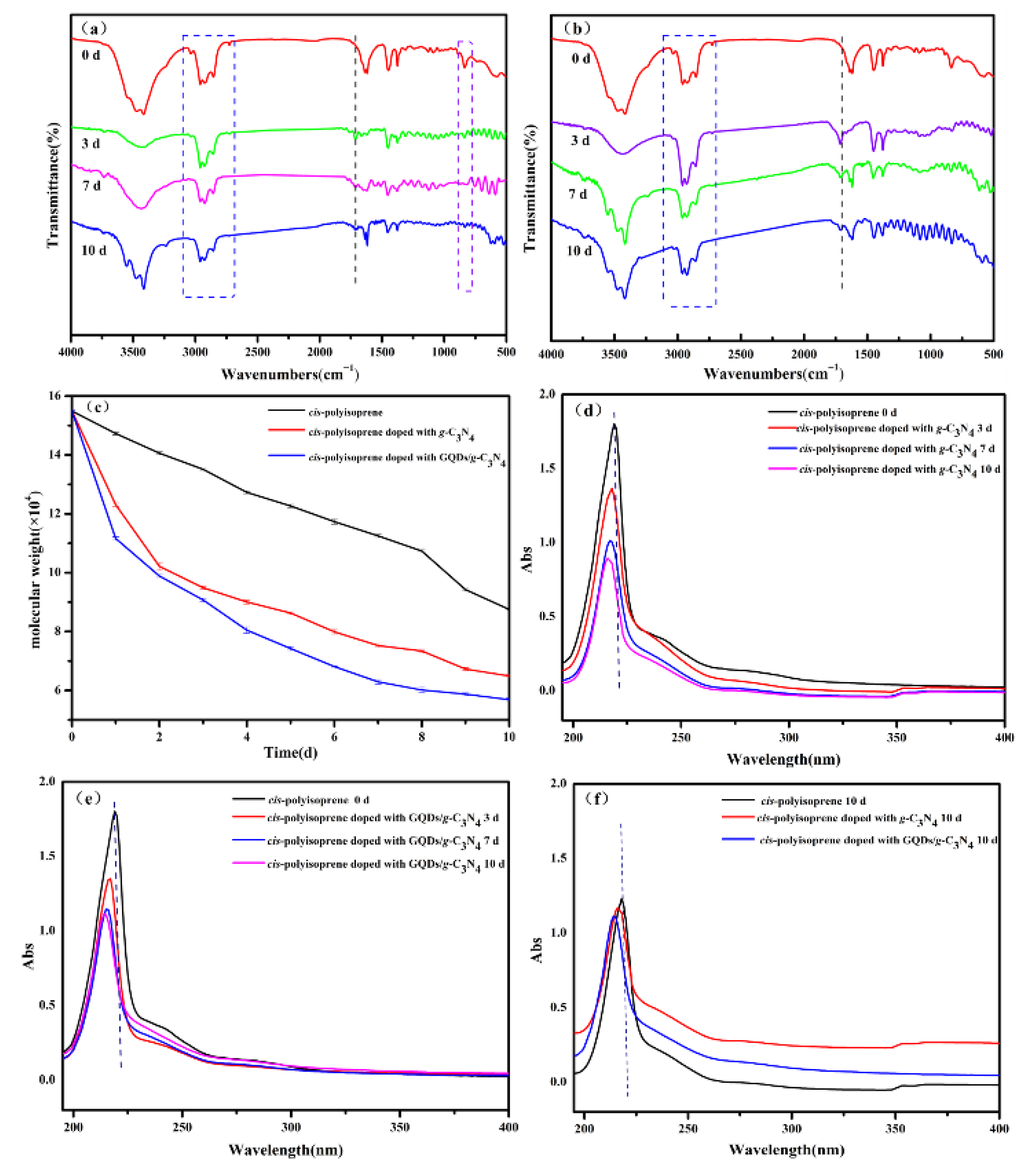 FT-IR spectra of cis-polyisoprene mixed with g-C3N4 (Figure 6a) and GQDs/g-C3N4 (Figure 6b) were observed under ultraviolet aging for 10 days. The cis-polyisoprene underwent oxidation, and oxidation products such as alcohol and acids were formed during UV light aging. The methylenes on the main polymer chains were broken, and the free radicals formed under the action of ultraviolet light. The oxidative degradation led to a reduction in the methylene peak. A large amount of ·O2− is formed in the process of photocatalytic reaction caused by the main chain breaking, and ·OH is formed in the degradation process. The generated free radicals improved the light absorption and accelerated charge transfer. The Mw reduced from 15.49 × 104 to 6.05 × 104 after adding g-C3N4 into cis-polyisoprene (Figure 6c). Compared with pristine g-C3N4, the light capture ability of GQDs/g-C3N4 was significantly improved. A higher chance of an electronic attack was received for a reactive substrate under the condition of a long decay time [23,40]. The methylene in cis-polyisoprene substrate was oxidized, and the breakage of the C=C bond led to short-chain segments, which resulted in the decreased molecular weight [39].