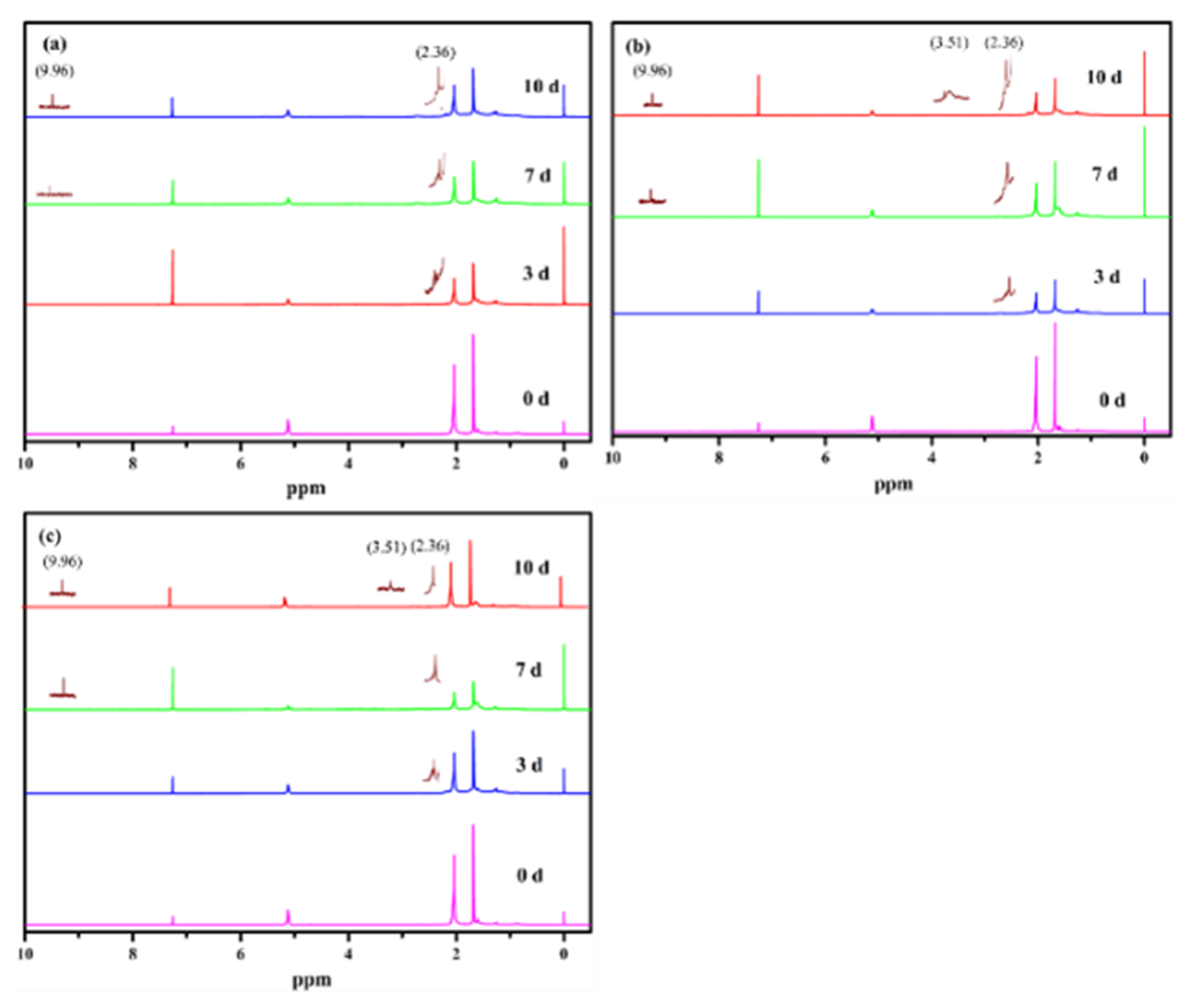 The effect of UV irradiation on the structure of cis-polyisoprene was characterized by 1H-NMR as shown in Figure 7a-c. The main absorption signals of cis-polyisoprene were the double bond -CH= at 5.12 ppm and the α-carbon at 1.67 ppm. After UV aging for 7 days, new signals were observed around 2.6 ppm and 4.1 ppm, assigned to the α-H of the ketone and the hydrogen of the ester. The signal of 9.86 ppm was attributed to the proton of the aldehyde.