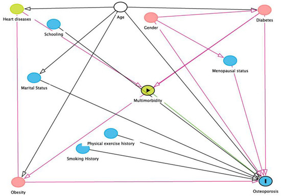 A directed acyclic graph for adjusting confounders in the associations between age, gender, marital status, physical exercise history, smoking history, the menopausal status of females, schooling, morbidity (diabetes and cardiovascular disease), multimorbidity, and RO is provided in Figure 1. This graph method depicts hypothesized causal relationships and deduces the statistical associations implied by these causal relationships. Here, we consider RO as the outcome variable and multimorbidity as the primary exposure variable. Minimum sufficient adjustment sets were derived, containing obesity, gender, diabetes, multimorbidity after adjustment of age for estimating the direct effect of osteoporosis.