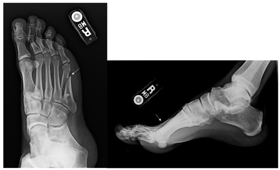 Radiographs of a Metatarsal Fracture Displaced Greater than 4 mm. Displayed above are radiographs of a fifth metatarsal shaft fracture displaced greater than 4 mm. The arrows above identify the fifth metatarsal fracture.