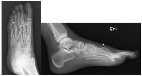 - Armagan, O.; Shereff, M. Injuries to the Toes and Metatarsals. Orthop Clin. N. Am. 2001, 32, 1–10. [Google Scholar] [CrossRef]