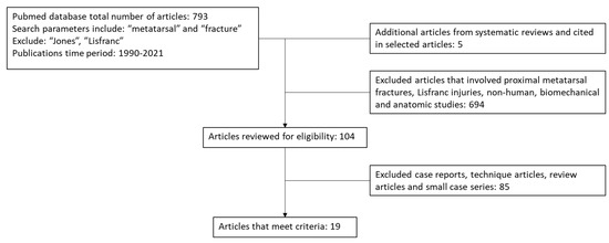 In this case, 793 articles were initially obtained and reviewed by the study team. Additionally, 638 articles were excluded as they discussed proximal metatarsal fractures, Lisfranc injuries, non-human fractures, biomechanical and anatomic studies. Of the remaining 104 articles, 86 were excluded as they were case reports, small case series, technique articles, or review articles. Full text was obtained and reviewed for 19 remaining articles (Figure 6).
