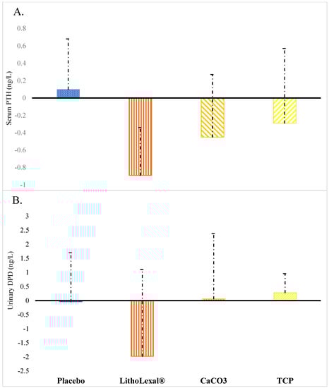 Changes observed in postmenopausal women after three months of treatment with placebo or active intervention in (A) serum PTH and (B) urinary DPD (a biomarker of osteoclastic activity). Error bars display standard deviation (SD). Abbreviations: CaCO3 = calcium carbonate; TCP = tricalcium phosphate; DPD = deoxypyridinoline. This figure is based on data from a clinical study by O’Gorman and colleagues.