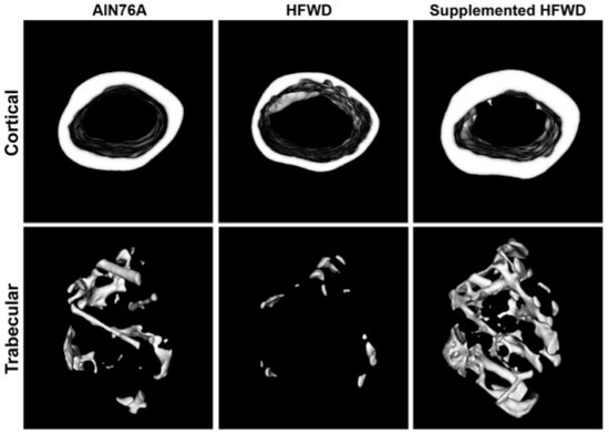 Micro-CT cross-sectional images of mid-diaphysis (cortical) and distal metaphysis (trabecular) regions of femora from female mice on low-fat (AIN76A), high-fat (HFWD) and high-fat supplemented with LithoLexal® diets (adopted from Aslam et al.) [20].