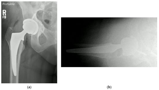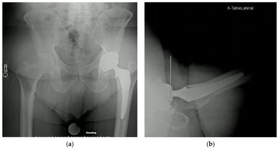 Class III right hip protrusio patient post-operative XR ((a) AP hip XR; (b) lateral hip XR).