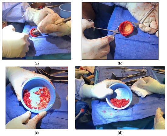 Collection and preparation of femoral head bone graft ((a) reaming of femoral head; (b) cortical shell of femoral head to be morselized; (c) two sizes of bone graft, finer graft from femoral head reamings on left and coarser graft from morselized femoral head cortex on right; (d) both sizes of bone graft mixed for impaction grafting).