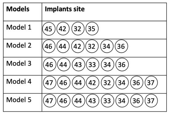 Models identified according to implant placement sites.