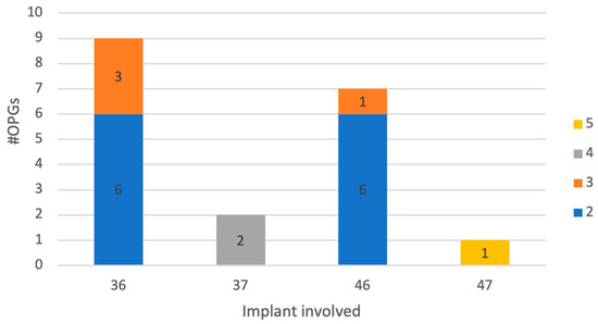 The presence of a peri-implant bone defect was detected in 19 (37.2%) of the 51 OPGs. Specifically, 16 (84.2%) belonged to the six-implant rehabilitation group and 3 (15.8%) belonged to the eight-implant rehabilitation group; none of the four-implant rehabilitations were affected by peri-implant bone loss. Instead, regarding the division into models, bone loss was obtained in 12 (63.2%) OPGs, in which full-arch rehabilitation followed pattern 2, affecting the implants in position 3.6 and 4.6, 4 (21.1%); with pattern 3 affecting the implants in position 3.6 and 4.6, 2 (10.5%); with pattern 4 affecting the implant in position 3.7, 1 (5.3%); with pattern 5 affecting the implant in position 4.7; and no one with full-arch rehabilitation that followed pattern 1. Distribution of implants with bone loss according to division into models was shown in Figure 2.