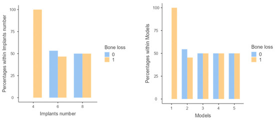 Statistical analysis using a χ² test showed that there was a statistically significant difference between peri-implant bone loss and the number of implants (p = 0.002), the implant position (p < 0.001), and the models into which the sample was divided (p = 0.013). The distribution of peri-implant bone loss in relation to the number of implants and models is shown in Figure 4.