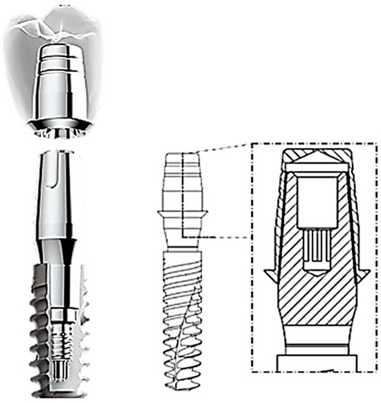 - Sannino, G.; Barlattani, A. Mechanical evaluation of an implant-abutment self-locking taper connection: Finite element analysis and experimental tests. Int. J. Oral Maxillofac. Implant. 2013, 28, e17–e26. [Google Scholar] [CrossRef] [PubMed]