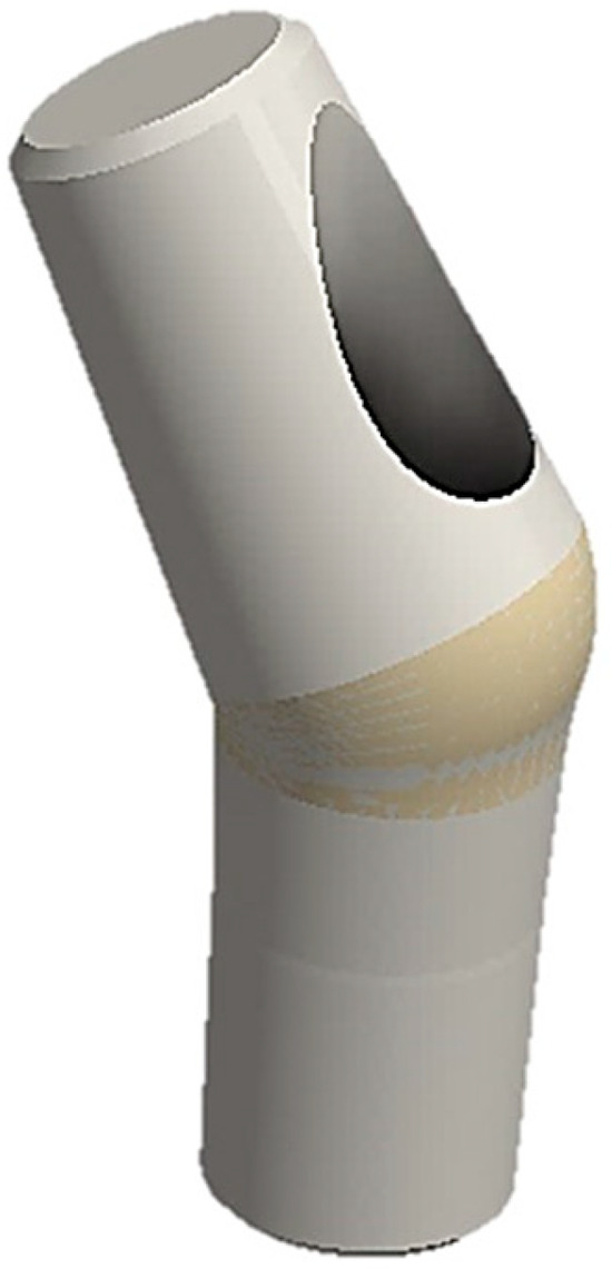 Three-dimensional 3D model of the abutment–cap–crown system inclined at 15° (on the left) and 30° (on the right).