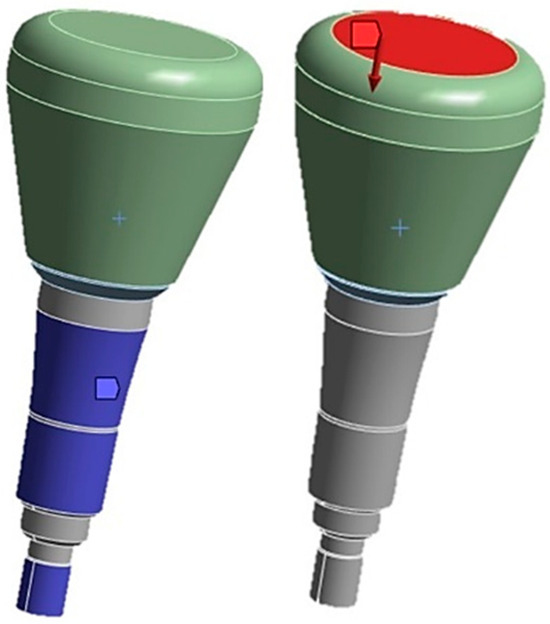 Between the crown and the cap, a fixed type of contact without penetration was imposed. The contact analysis assigned the cap as the target element, indicated in red (Figure 7), referring to finite elements in the FEA that were considered particularly important or relevant to the analysis aim. Conversely, the “contact elements” modeled the contact surfaces between the parts and are shown in blue (Figure 7).
