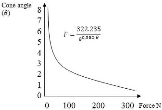Some studies revealed an inverse relationship between the retentive force and the taper angle of the cap [22,23]. Bozkaya and Muftu [22] performed a numerical–mathematical evaluation to assess the efficiency () of the Morse cone connection, which is defined by the ratio of extraction force (Fout) to insertion force (Fin) shown in Equation (1):