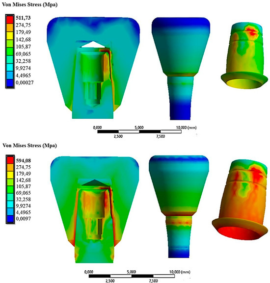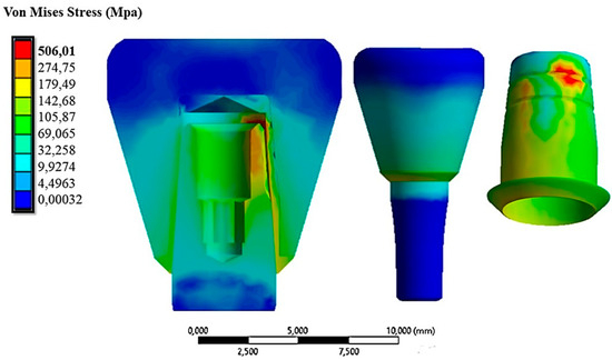 Figure 9 shows the von Mises stress distribution on the abutment–cap–crown system under an insertion load of 10 N.