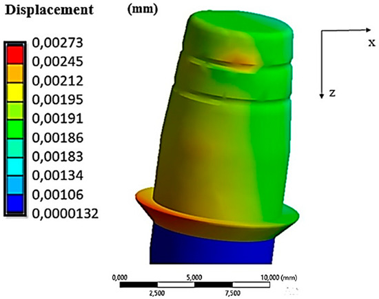 The von Mises stress ranged between 0.0032 MPa and 506.01 MPa. The maximum stress values were found on the cap due to its thinness, resulting in increased stress. Figure 9 also shows stress values ranging between 35 MPa and 120 MPa in the area of contact with the cap on the zirconia crown. This stress field did not impair the mechanical behavior of the material since, as described in Table 1, the breakdown stress of zirconia is approximately 551 MPa. In Figure 10, the displacement field in comparison with the cap is shown because the abutment was fixed in all directions.