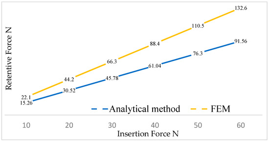 Among the three criteria presented, it was noticed that the FEA approach provided results closer to the values obtained experimentally through in vitro studies. Specifically, for a cap insertion force of 30 N, the FEA method yielded a retention force of approximately 66.3 N, while the analytical method produced 45.78 N, compared with the in vitro study value of 68.8 N.