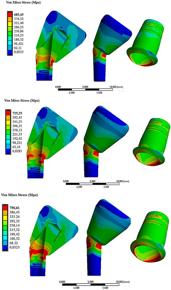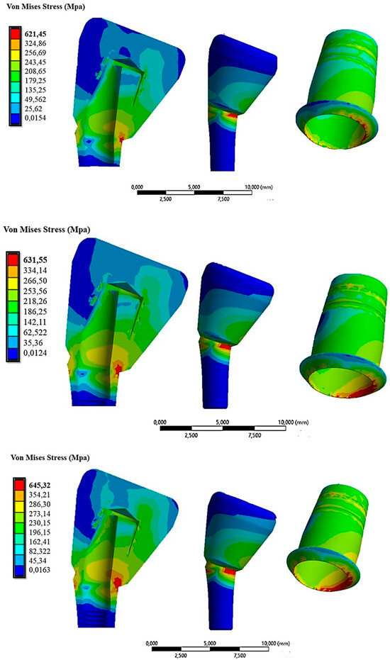 From Figure 14, it was evident that the 15° inclination of the abutment resulted in increased stress on both the abutment and the cap. Specifically, in the red areas, the maximum stress varied from 621.45 MPa with 10 N of insertion to 645 MPa with 60 N of insertion on the cap.