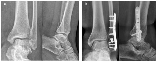 - Smeeing, D.P.; Houwert, R.M.; Briet, J.P.; Kelder, J.C.; Segers, M.J.; Verleisdonk, E.J.; Leenen, L.P.; Hietbrink, F. Weight-bearing and mobilization in the postoperative care of ankle fractures: A systematic review and meta-analysis of randomized controlled trials and cohort studies. PLoS ONE 2015, 10, e0118320. [Google Scholar] [CrossRef]