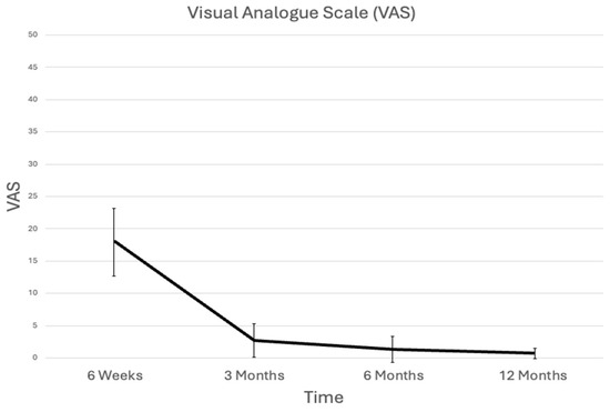 The Visual Analogue Scale (VAS) score demonstrated a progressive reduction during the initial 6 week post-treatment period, with near-complete pain resolution after 3 months. (Figure 4).