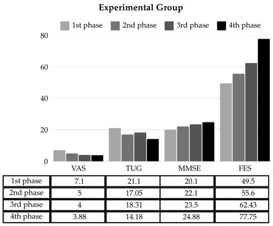 Analysis of the difference between the assessment phases in relation to the average of pain (VAS), functionality (TUG), cognitive function (MMSE), and risk of falls (FES) in the experimental group.
