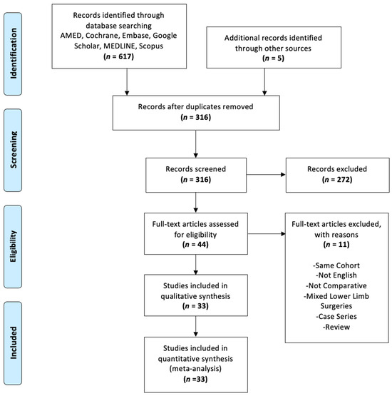 Two authors (AHK and MT) independently conducted comprehensive searches across multiple databases, including AMED, Cochrane, EMBASE, Google Scholar, MEDLINE and Scopus. The search strategy, developed using both text words and Medical Subject Headings (MeSH) terms, utilised Boolean operators “AND” and “OR” to construct a comprehensive search string. This strategy included terms such as “Hallux valgus”, “Bunion”, and “bunionectomy” combined with “Minimally invasive”, “MIS”, “minimally invasive chevron and akin”, “MICA”, “percutaneous”, “percutaneous chevron akin”, “PECA”, “PDO”, “percutaneous distal osteotomy”, “Isham”, “Bosch”, “Bösch”, “SERI”, and “Simple, Effective, Rapid, Inexpensive”, as well as “Open osteotomy”, “Open akin”, “open chevron”, “open scarf”, “open surgery”, and “open osteotomy”. The search was conducted without language or publication date restrictions to encompass both historical and contemporary studies. Databases were searched from their inception up to 25 January 2024, when the final search was completed.