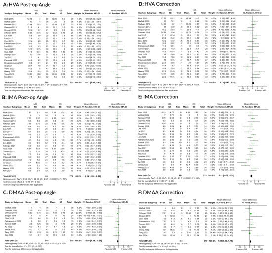 Forest plots of radiographic outcomes. (A) Postoperative HVA between MIS and open groups; (B) postoperative IMA; (C) postoperative DMAA; (D) HVA correction; (E) IMA correction and (F) DMAA correction. HVA, hallux valgus angle. MIS, minimally invasive surgery. IMA, intermetatarsal Angle. DMAA, distal metatarsal articular angle [4,11,12,21,24,25,26,28,29,30,31,33,34,35,36,37,39,42,43,44,45,47,48].
