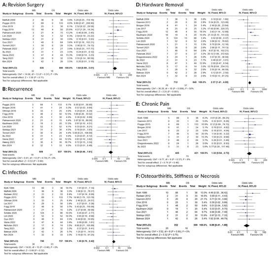 Forest plots of complications. (A) Odds of revision surgery between MIS and open groups; (B) recurrence; (C) infection; (D) hardware removal; (E) chronic pain and (F) osteoarthritis, stiffness or necrosis. MIS, minimally invasive surgery. [4,11,12,21,22,25,28,29,30,31,32,33,34,35,36,37,39,40,42,43,44,45,46,47,48,49].