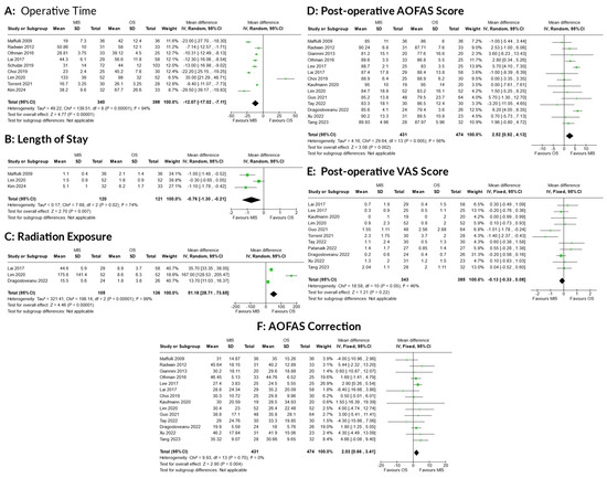 Forest plots of postoperative outcomes and surgical metrics. (A) Operative time between MIS and open groups; (B) length of stay; (C) radiation exposure; (D) postoperative AOFAS score; (E) postoperative VAS score and (F) AOFAS correction. MIS, minimally invasive surgery. AOFAS, American Orthopedic Foot and Ankle Society. VAS, visual analogue score [4,11,12,21,25,26,28,29,32,33,35,37,38,39,42,43,45,47].