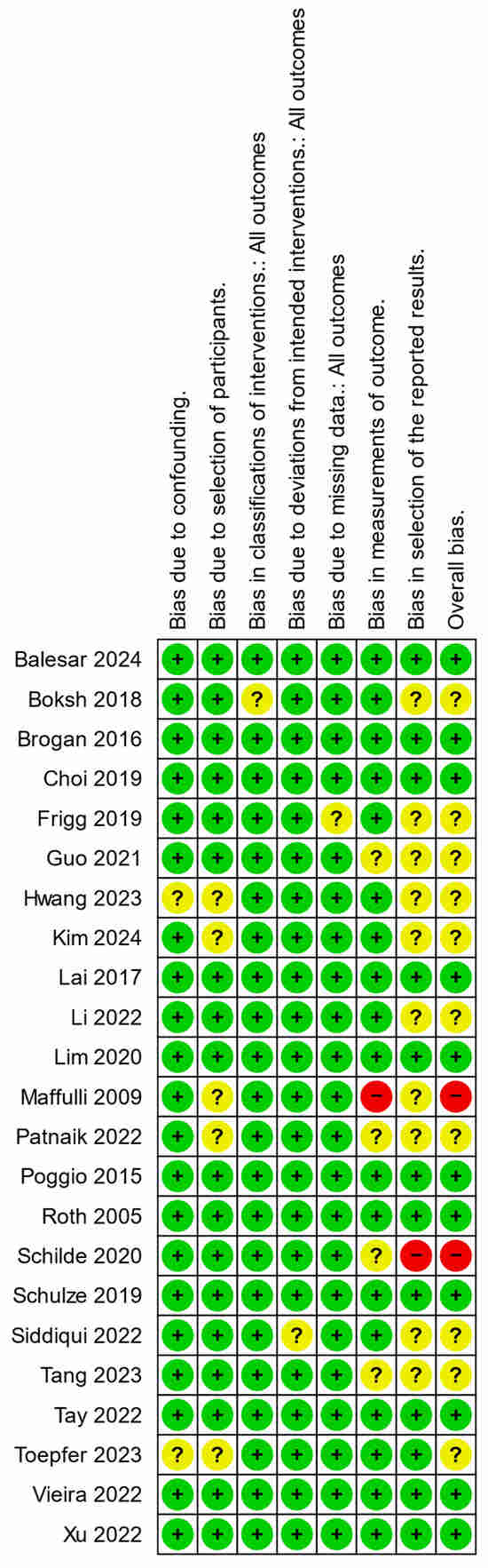 The quality of all non-randomised studies was evaluated using the ROBINS-I tool, which assesses bias across domains such as confounding, participant selection and outcome measurement. For randomised controlled trials, the RoB 2 tool, a revised Cochrane risk-of-bias tool, was used to analyse potential biases in randomisation, deviations from intended interventions and outcome reporting.