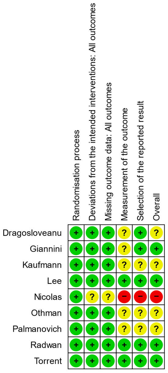 Quality assessment for randomised controlled trials (RCTs) using the RoB 2 tool. Key: +, low risk of bias; −, high risk of bias; ?, undetermined risk of bias [11,22,28,33,34,35,43,45,47].