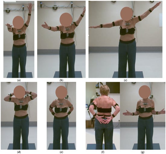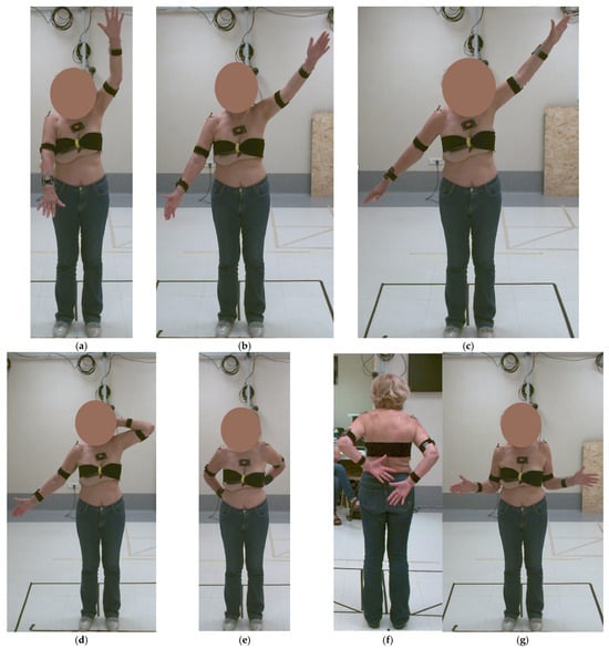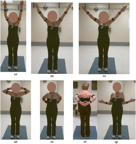 Figure 2. Preoperative kinematic analysis: (a) elevation in the sagittal plane—Task 1, (b) in the scapular plane—Task 2, (c) in the frontal plane—Task 3, (d) hand-to-the-nape—Task 4, (e,f) hand-to-the-back—Task 5, and (g) external rotation—Task 6.