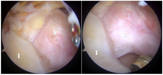 Figure 3. Subacromial view demonstrating full-thickness rotator cuff tear involving the supraspinatus (S) and infraspinatus (I) tendons. Only sheet 2 of the supraspinatus tendon is visible, while both sheets 2 and 3 of the infraspinatus tendon are present.
