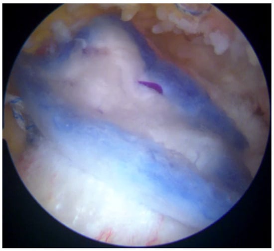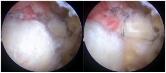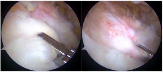 Post-repair arthroscopic visualization revealed a partial repair of the supraspinatus tendon, leaving a noticeable gap in the rotator cuff tissue (Figure 5).