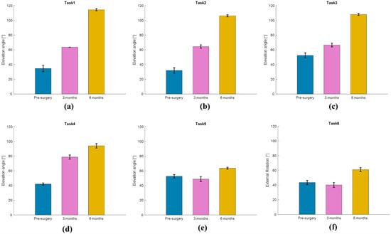 For Task 1, the results showed shoulder elevation angles equal to 34.6 ± 4.3°, 63.6 ± 0.1°, and 114.4 ± 1.5° before surgery, after 3 months, and after 6 months, respectively (Figure 10a). For Task 2, the results showed shoulder elevation angles equal to 31.9 ± 3.7°, 64.5 ± 2.2°, and 106.2 ± 1.3° before surgery, after 3 months, and after 6 months, respectively (Figure 10b). For Task 3, the results showed shoulder elevation angles equal to 52.4 ± 3.4°, 66.5 ± 2.6°, and 108.0 ± 1.3° before surgery, after 3 months, and after 6 months, respectively (Figure 10c). For Task 4, the results showed shoulder elevation angles equal to 42.0 ± 1.5°, 78.7 ± 2.8°, and 94.0 ± 3.0° before surgery, after 3 months, and after 6 months, respectively (Figure 10d). For Task 5, the results showed shoulder elevation angles equal to 52.6 ± 2.3°, 48.8 ± 3.3°, and 63.6 ± 1.2° before surgery, after 3 months, and after 6 months, respectively (Figure 10e). For Task 6, the results showed that shoulder external rotation was equal to 43.4 ± 3.0°, 40.1 ± 3.3°, and 60.9 ± 2.7° before surgery, after 3 months, and after 6 months, respectively (Figure 10f).