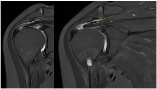 Figure 12. Preoperative MRI with identification of the line of the tear and the two separated sheets of the supraspinatus tendon, with different retraction.