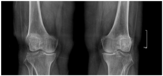 Her knee pain had persisted for several years and was unresponsive to conservative treatments, including physiotherapy and pharmacological pain management. She reported that the pain was continuous, affecting both day and nighttime, and was exacerbated by walking long distances and climbing stairs. Physical examination revealed a left knee varus deformity with a 5° fixed flexion contracture and a maximum flexion of 100°. Plain radiographs demonstrated advanced-stage osteoarthritis (OA) of both knee joints with mostly medial compartment involvement (Figure 1). After exhausting all conservative treatments, the patient was counseled and consented to undergo staged bilateral primary, elective TKA.