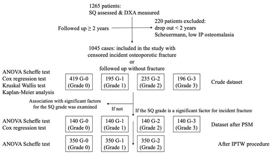 As a next step, the probability of incident VF for each SQ grade group was compared using an ANOVA Scheffé test after leveling the confounding factors in the crude dataset with the PSM technique. Furthermore, if SQ grading was not listed for any of the incident osteoporotic fractures, the probability of the other incident fractures for each grade group after PSM was also compared using the ANOVA Scheffé test. The mean values of the background clinical data for each grade group were similarly compared using the Scheffé test.