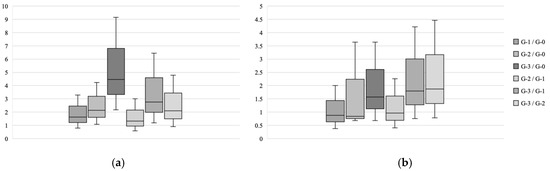 Comparison of Hazard ratios of incident VFs in the crude dataset and the dataset after PSM represented with a box plot graph. The central line shows the median value, the box shows the standard error, and the upper and lower bars show the 95% confidence interval. (a): In the crude dataset, G-2/G-0, G-3/G-0, and G-3/G-1 show significantly higher Hazard ratios of 2.13, 4.47, and 2.76 for each comparison group; that represents the lower bar exceeds the line of one, respectively. (b): In contrast, no comparison groups demonstrate a significant difference between the two groups.