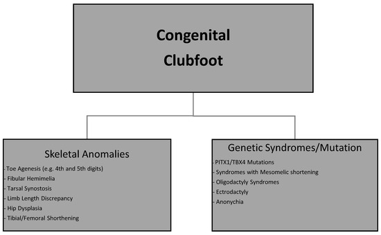 - Dobbs, M.B.; Gurnett, C.A. Genetics of clubfoot. J. Pediatr. Orthop. B 2012, 21, 7–9. [Google Scholar] [CrossRef] [PubMed]