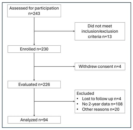 This is a prospective, multi-center observational cohort study (Clinicaltrials.gov identifier: NCT04817969) to confirm the long-term performance, and clinical benefits of the Persona® Ti-Nidium Total Knee System and instrumentation (Zimmer Biomet, Warsaw, IN, USA) in primary and revision TKA. This system builds on the clinical legacy of the NexGen® LPS Flex Tivanium® Knee System (Zimmer Biomet, Warsaw IN, USA), combining the Persona Knee instrument platform and anatomical implants with nitrided Ti-6Al-4V alloy [40] and Vivacit-E®, Vitamin E infused HXLPE bearings (Zimmer Biomet, Warsaw, IN, USA). The study was designed to enroll a total of 240 consecutive patients at seven sites within the United States, to include 60 patients into each of the following variants: posterior stabilized/constrained posterior stabilized (PS/CPS), cruciate retaining (CR), ultra congruent (UC), and medial congruent (MC) femoral components. The primary endpoint was an improvement in the Oxford Knee Score (OKS), defined as the minimal clinically important difference (MCID, 7.0 points) [41]. The sample size required was based on the overall group mean improvement of the OKS, assuming an expected change of 12.2 ± 8.4 points in each group. Considering 80% power and alpha set at 0.05, 23 patients per variant would be required; assuming a 40% attrition rate, 39 patients would be required per variant. To better support secondary endpoints within the investigation, this was expanded to 60 patients to be enrolled within each articular surface combination group. The study was designed to obtain long-term follow-up information up to 10 years after implantation in all eligible participants. This report describes the 2-year results of the study; 230 patients have been enrolled; enrollment continues in the cruciate retaining cohort at the time of writing. Patient flowchart is shown in Figure 1.