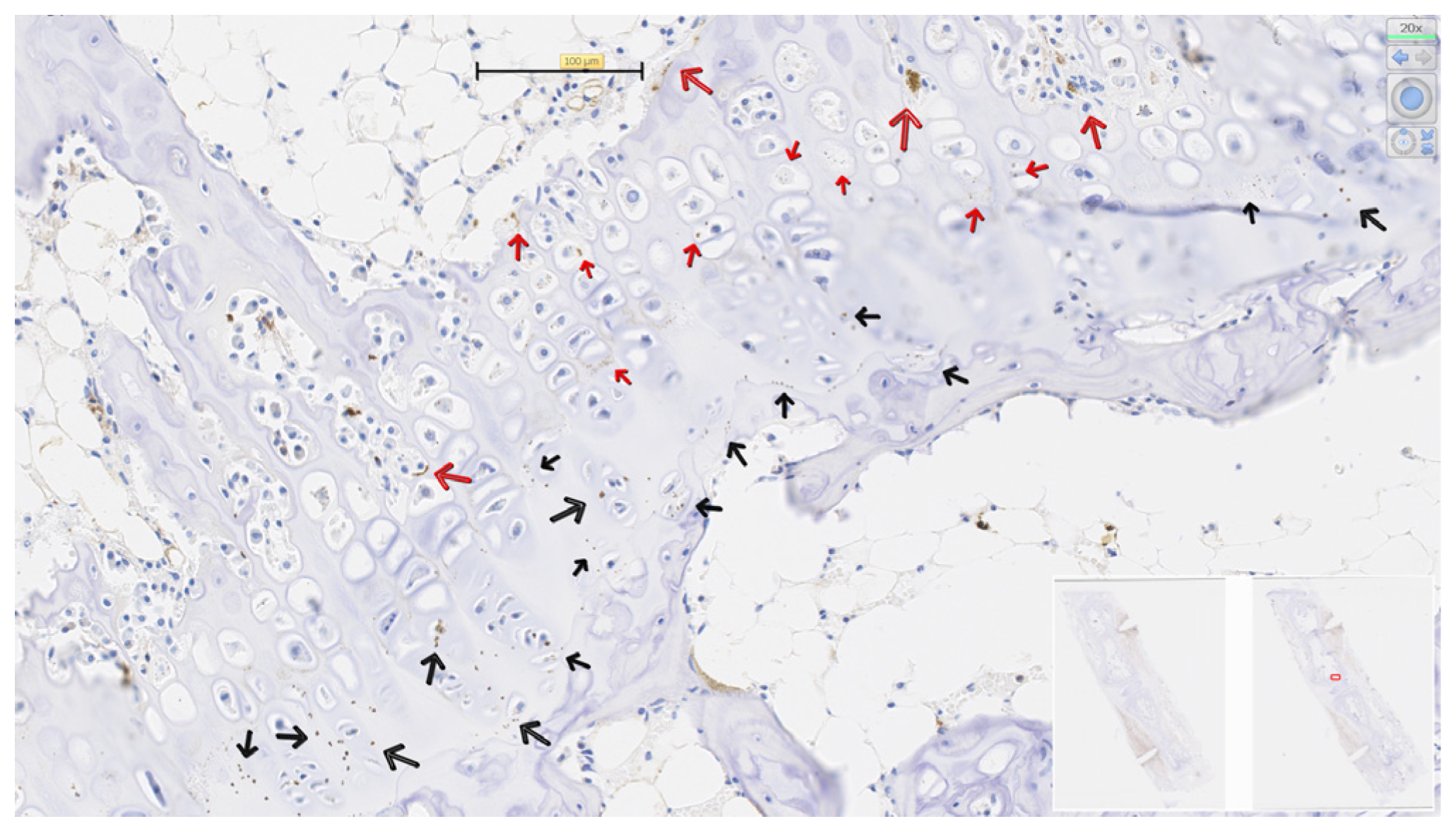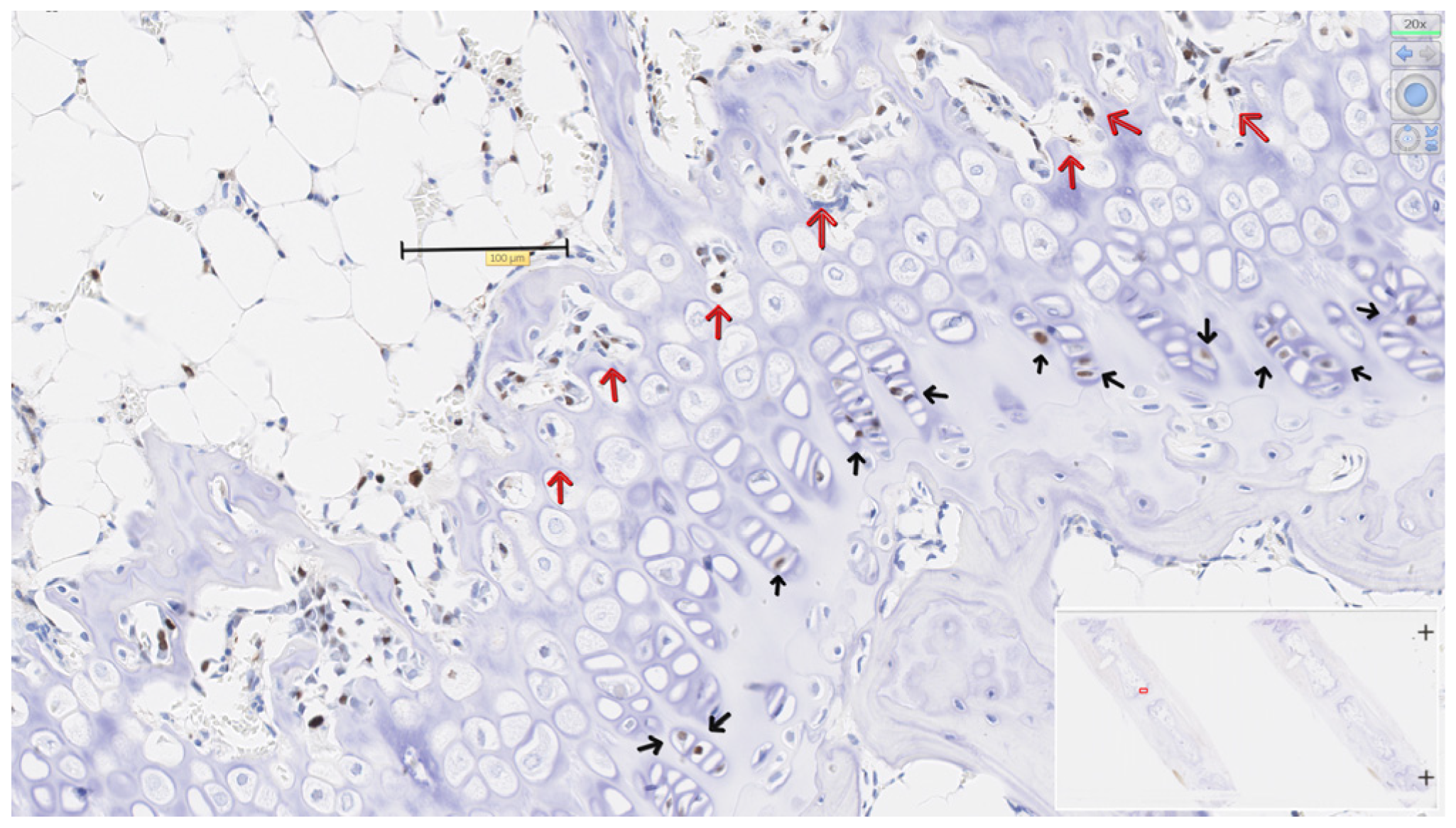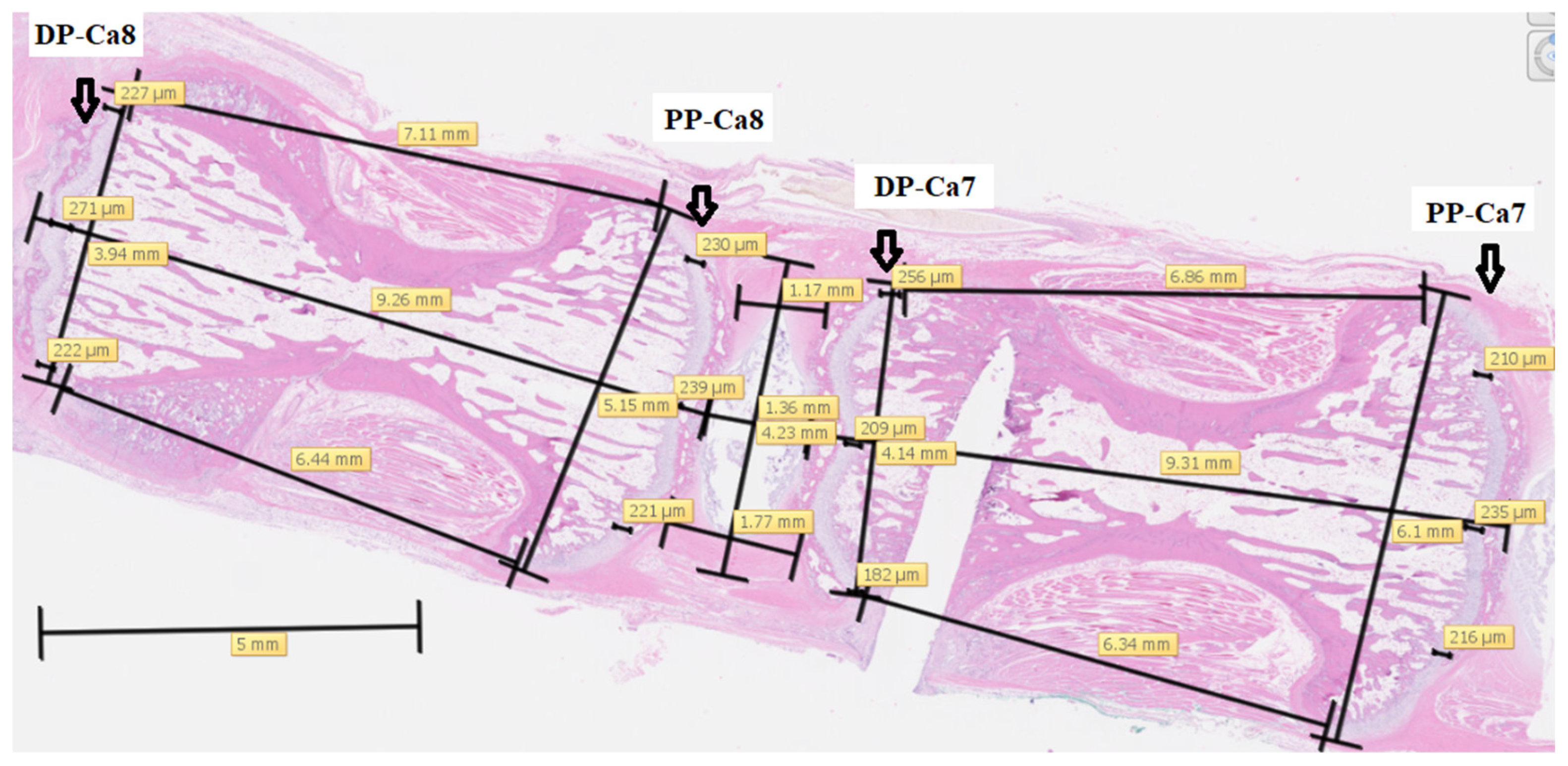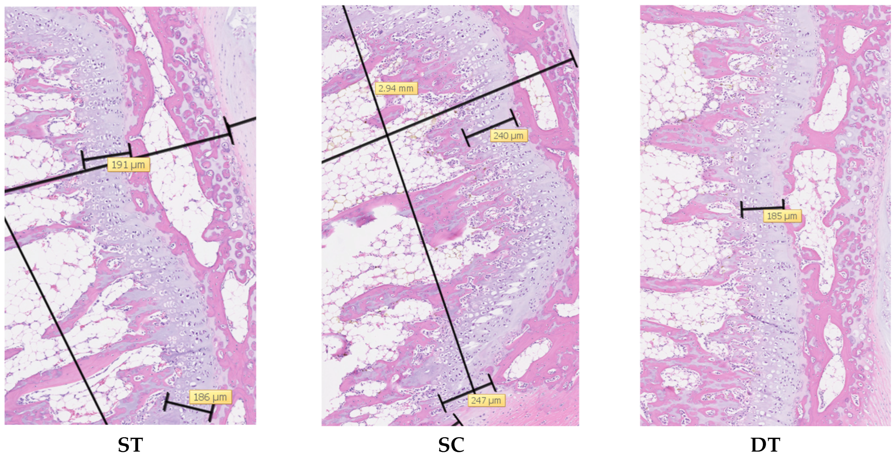 Hypertrophic (Middle) of Distal Physis (μm) | 97.93 ± 28.15 a6 | 64.3 ± 18.28 | 62.22 ± 19.73 b3 |